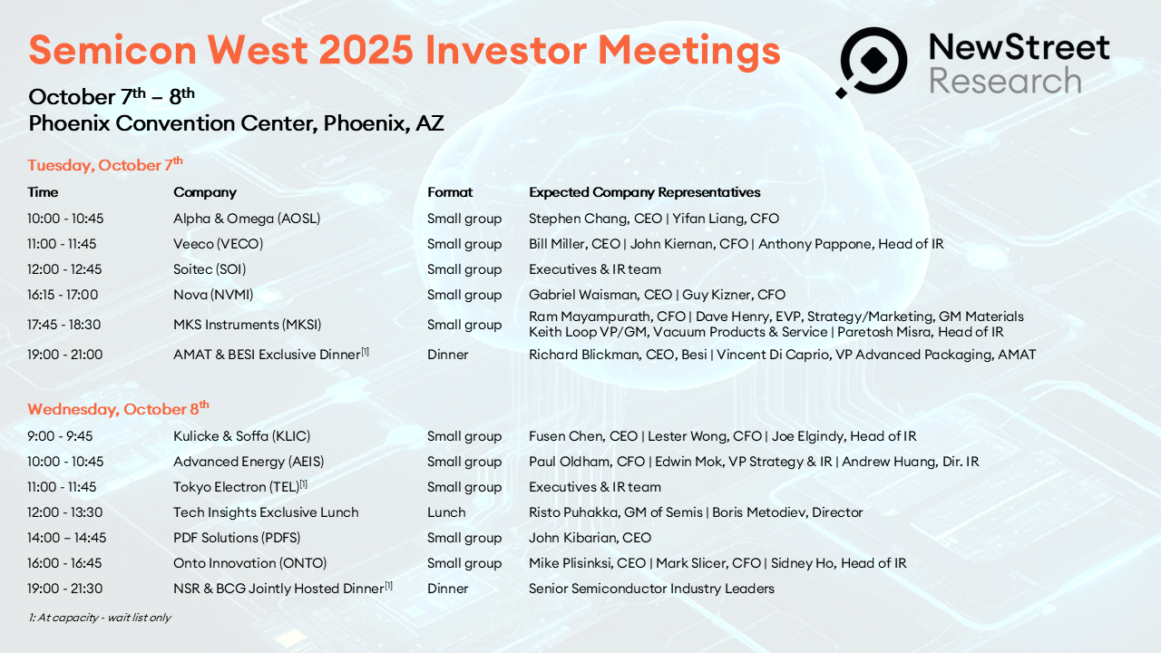 Semicon West 2025 is just around the corner. NSR is excited to offer a strong lineup of meetings across the semicap ecosystem. Below is our final agenda.